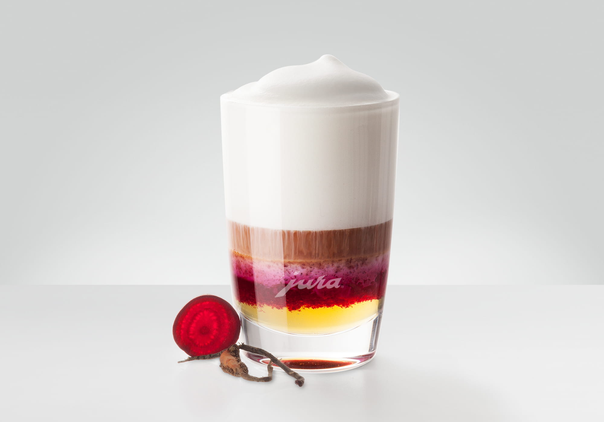 • Do szklanki do latte macchiato nałóż 2 łyżeczki puree z buraków, miód i sproszkowany imbir.